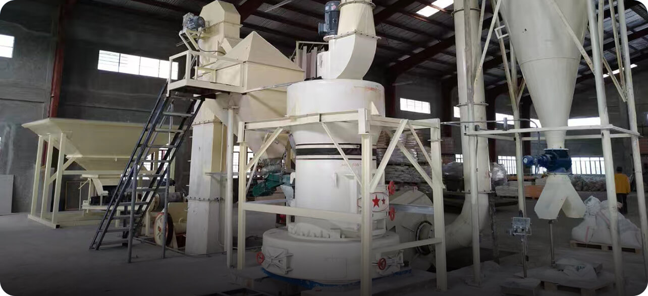 大塊物料進(jìn)入顎式破碎機(jī)后進(jìn)行初級破碎,然后由斗式提升機(jī)將合適粒度的物料均勻送至儲料倉。通過電磁振動給料機(jī)把儲料倉的物料均勻、定量、連續(xù)地送到磨粉機(jī)的研磨室內(nèi)進(jìn)行研磨。研磨后的粉末在鼓風(fēng)機(jī)的作用下吹向選粉機(jī)進(jìn)行分選,合格細(xì)粉則由管道送至儲料倉,分選后的不合格粉料回落繼續(xù)研磨,最后經(jīng)出料閥輸出即為成品粉料。篩分后合格的成品細(xì)粉隨管道裝置進(jìn)入收塵器內(nèi)分離收集,并統(tǒng)一用裝粉罐車打包或送入成品料倉內(nèi)即可。