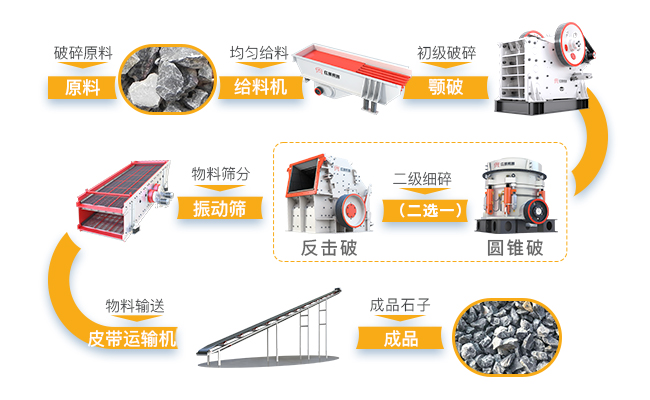 大塊石料經(jīng)料倉由振動給料機(jī)均勻的送進(jìn)顎式破碎機(jī)進(jìn)行粗碎,粗碎后的石料由膠帶輸送機(jī)送到反擊破/圓錐破進(jìn)行進(jìn)一步破碎,細(xì)碎的石料由膠帶輸送機(jī)送到振動篩進(jìn)行篩分,篩分出幾種不同規(guī)格的石子,滿足顆粒要求的石子,由成品膠帶輸送機(jī)送往成品料堆,不滿足顆粒要求的石子,由返料膠帶輸送機(jī)送到反擊破/圓錐破進(jìn)行再次破碎,形成閉路多次循環(huán),成品粒度可按照用戶的需求,進(jìn)行組合和分級,可配置輔助的除塵設(shè)備,綠色環(huán)保。