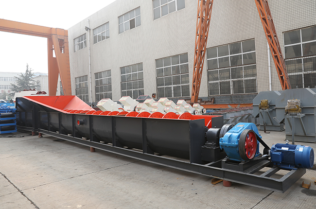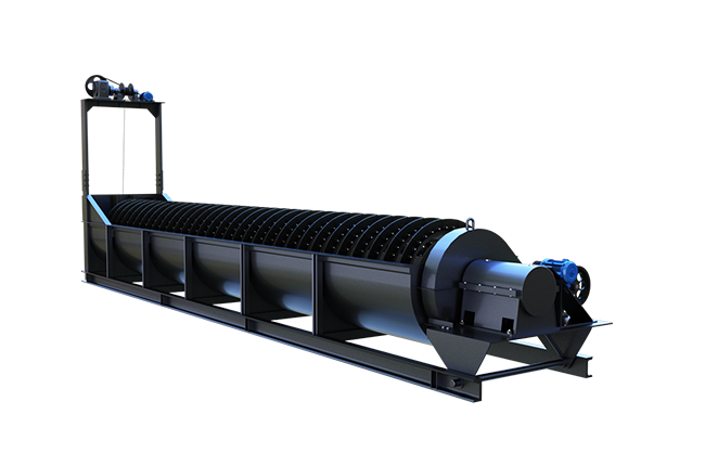 物料由給料箱均勻給入,連續(xù)給主槽體中注入一定量的水,傳動(dòng)部帶動(dòng)螺旋軸以一定的速度旋轉(zhuǎn),迫使物料在槽體中翻轉(zhuǎn)滾動(dòng)并向排料口運(yùn)動(dòng),細(xì)粒級(jí)物料和雜質(zhì)隨溢流水經(jīng)溢流堰排出,粗粒度物料由排料口排出,從而實(shí)現(xiàn)物料的洗選、分級(jí)、除雜和脫水。