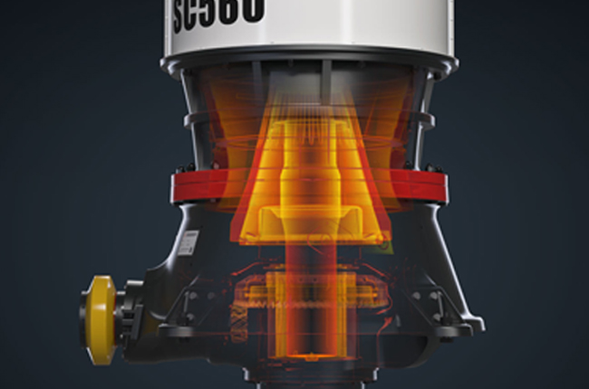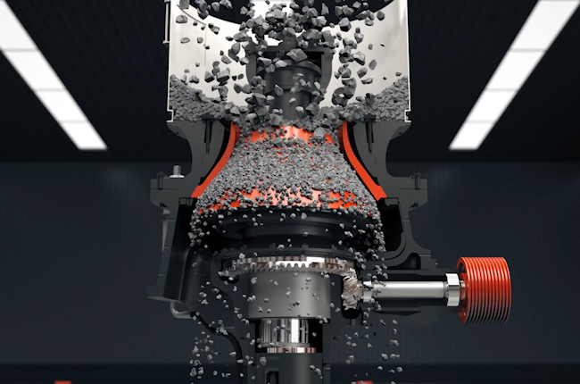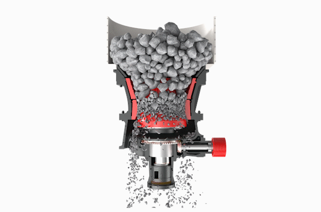 單缸圓錐破碎機(jī)工作時(shí),電機(jī)帶動(dòng)破碎機(jī)的小齒輪,小齒輪帶動(dòng)大齒輪,大齒輪組件帶動(dòng)偏心套組件和主軸組件以理論垂直線(xiàn)為中心,在銅襯套內(nèi)公轉(zhuǎn),主軸組件在偏心銅套內(nèi)以主軸的中心線(xiàn)可以實(shí)現(xiàn)自轉(zhuǎn)。當(dāng)物料加入到破碎腔后,主軸總成在物料的阻力下在偏心銅套內(nèi)緩慢的自轉(zhuǎn)。內(nèi)錐的運(yùn)行軌跡看起來(lái)是在破碎腔內(nèi)來(lái)回?cái)[動(dòng),同時(shí)緩慢的旋轉(zhuǎn)。物料被擺動(dòng)的內(nèi)錐擠壓破碎,破碎出的物料從而排料口排出。