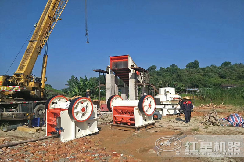 首先進行粗碎加工:粗碎階段使用顎式破碎機把大塊的鵝卵石原料打碎成較小粒度。它的進料粒度是120-1500mm,生產能力1-2200t/h。